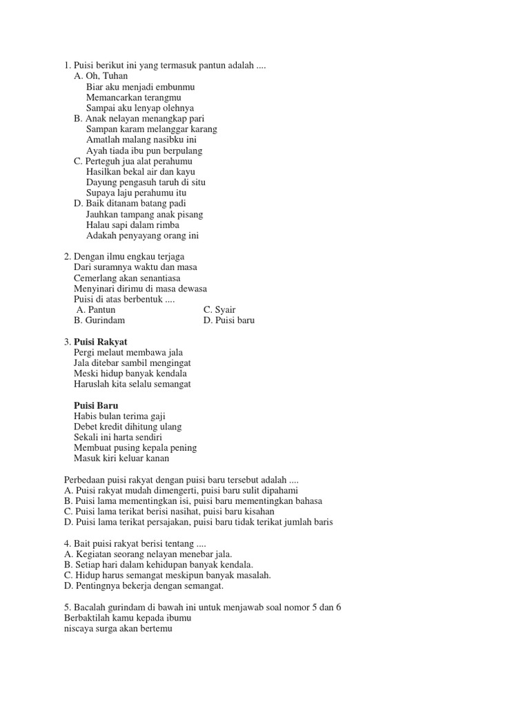 Nov 17 2018 Puisi rakyat berupa pantun syair gurindam atau puisi rakyat yang berkembang di kawasan tertentu. Puisi lama mementingkan isi puisi baru mementingkan bahasa. Puisi rakyat pergi melaut membawa jala jala ditebar sambil mengingat a.