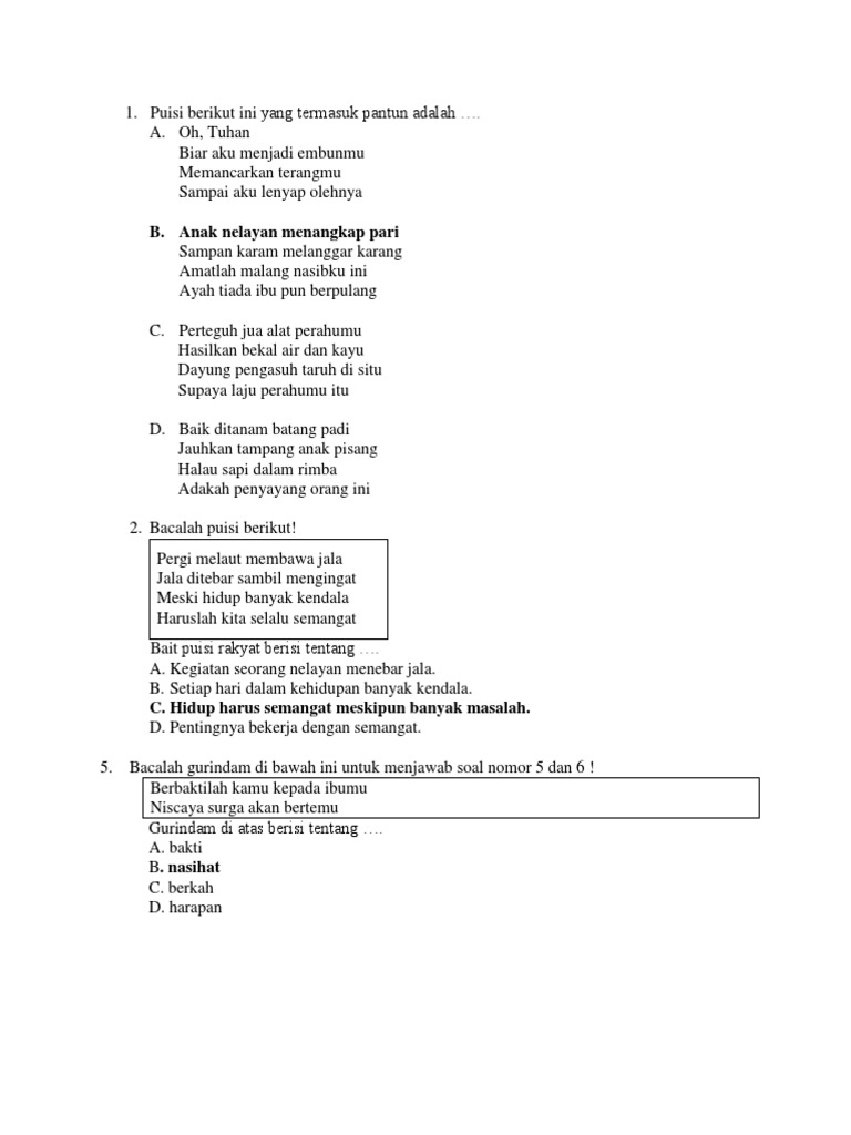 Menyimpulkan Isi Pantun Setelah mengenal ciri umum puisi rakyat pada bagian ini kamu akan membaca berbagai puisi rakyat untuk memahami isi yang berupa nilai-nilai luhur warisan nenek moyangmu Bacalah pantun berikut Nyanyikan dengan lagu Rasa Sayange Simpulkan nilai pada pantun berikut Pantun karya nenek. Meski hidup banyak kendala Haruslah kita. Pergi melaut membawa jala Jala ditebar sambil mengingat.